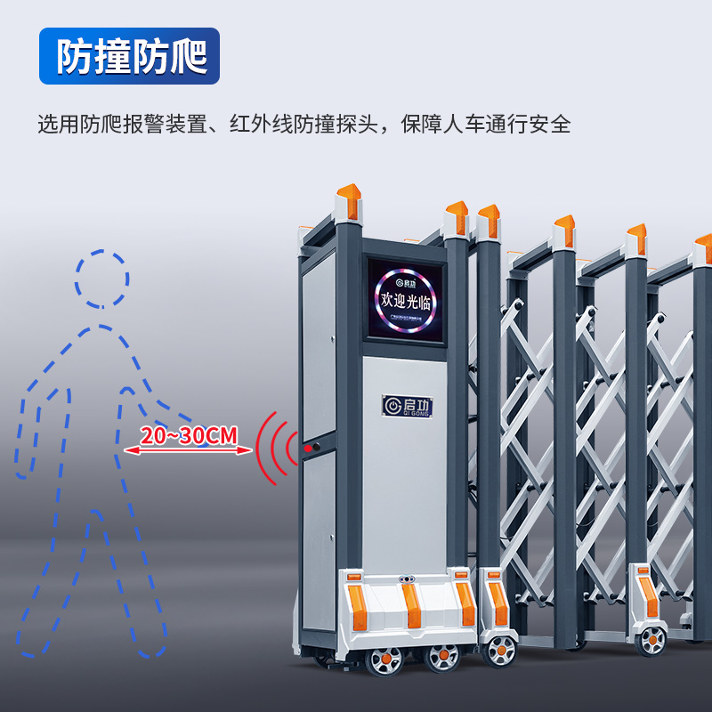 配备感应防撞功能,关门时距前方物体200mm内即自动停止或返回,保护行人安全;